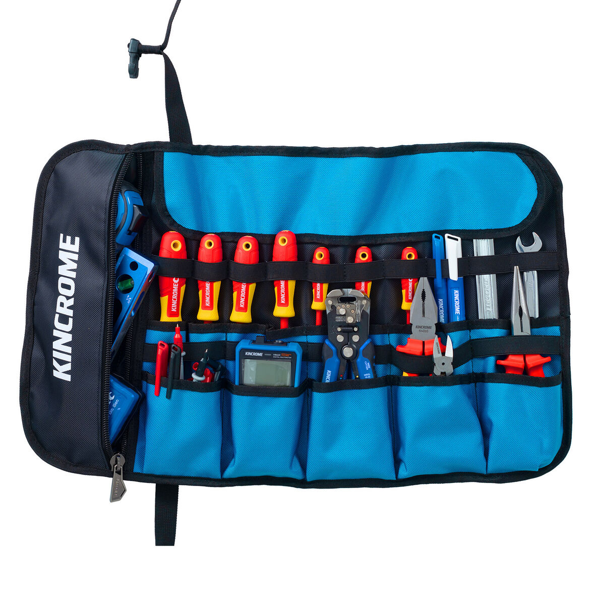 Introducing our Heavy-Duty 2-Tier 15 Pocket & 1 Zipper Tool Roll, built with durable 1680D polyester for long-lasting performance. The quick-release buckles ensure a secure closure, keeping your tools safe and organised. With 15 tool pockets, including 5 wide pockets perfect for pliers and 10 standard pockets for other tools, this roll offers plenty of storage. Elastic straps help keep your tools in place, and a zipper pouch provides extra space for loose bits. The extra-large zip puller makes access easy, while the water-resistant material protects against the elements. For added convenience, the tool roll features a carry handle, making it easy to transport to your next job or project.