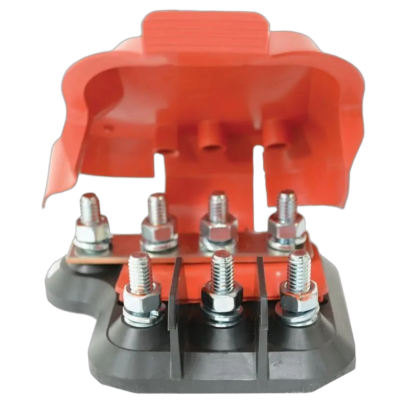3 WAY M8 MEGA FUSE HOLDER 300A COMBINED CURRENT RATING BLACK HOUSING RED EPDM COVER
