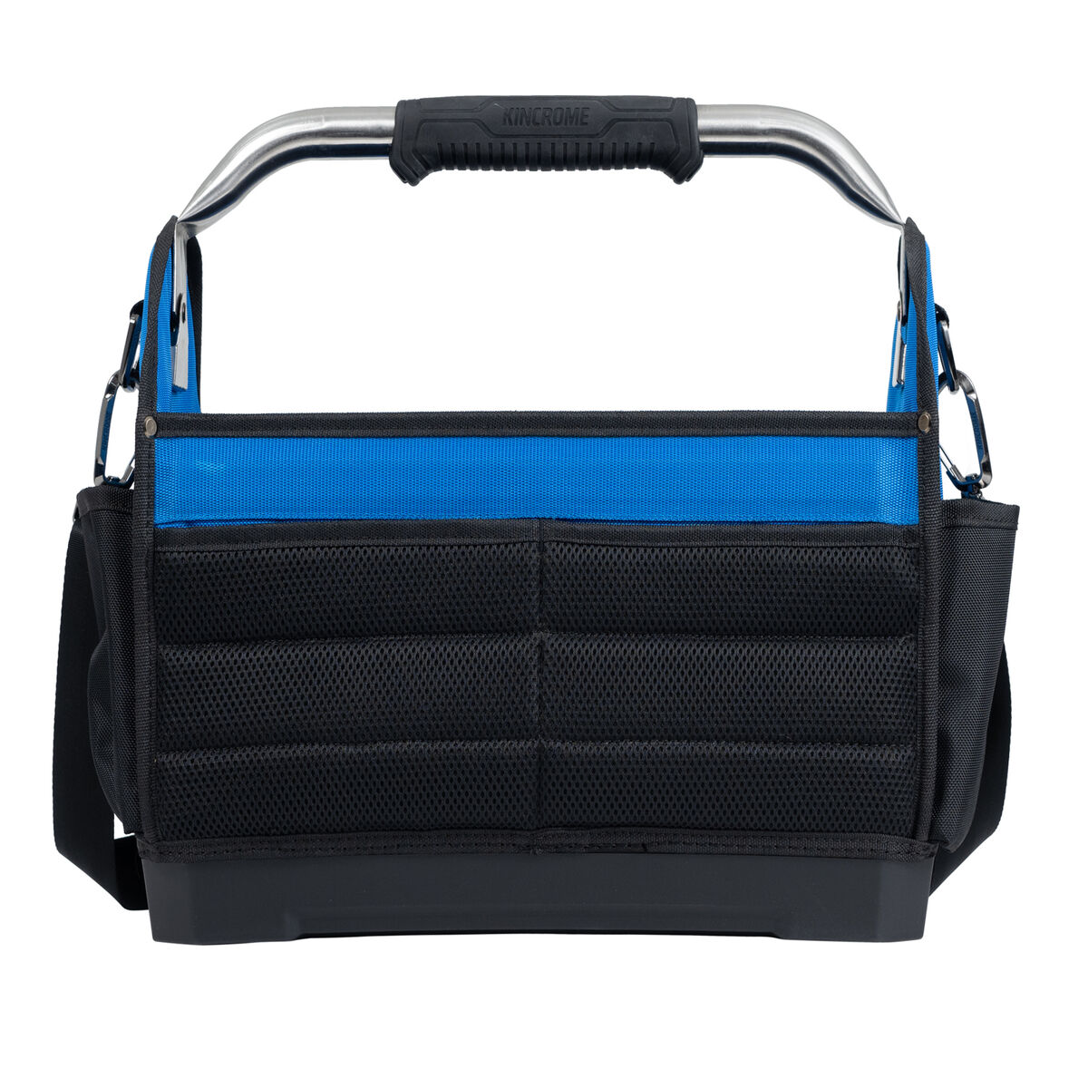 The 450mm Hard Base Open Tote Swivel Handle Bag designed for ultimate durability and ease of use, constructed from heavy-duty 1680D polyester for tough, long-lasting performance. Its over-sized TPR grip allows for easy single- or two-handed lifting, while the hard base offers impact resistance and waterproof protection to keep your tools safe in any environment. Swivel handle allows for storage of larger items such as power tools. With 14 pockets: 8 external & 6 internal — this bag provides plenty of room for organization, while 11 internal elastic tool loops ensure your gear stays in place. A concealed pouch for Bluetooth, GPS, and smart tracking devices adds extra security for your tech. The 25mm stainless steel carry handle is built to last, and the high-stress areas are reinforced with steel rivets for added strength. The water-resistant material treatment and ventilated padded back provide comfort and protection against the elements. The adjustable heavy-duty seat-belt shoulder strap with a wide padded shoulder pad ensures ease of carrying, while the heavy-duty metal D-rings, carabiner swivel clips, and internal tape measure clip make this bag the perfect tool storage solution for professionals on the go.