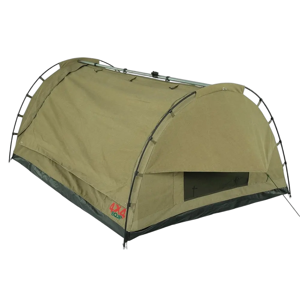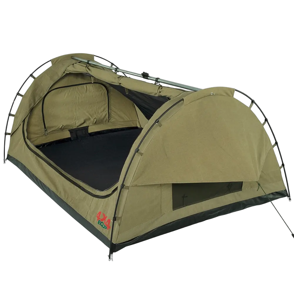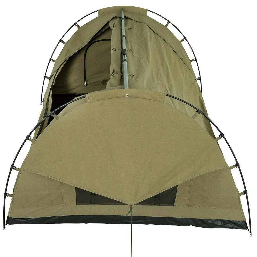 When space is a must while you sleep, the Dual Cab Double Swag has enough of room for everything. This large swag stands 1m tall and is made of waterproof 400gsm ripstop polycotton canvas that is seam-sealed for weather protection. It's self-supporting, with reinforced canvas pole end sleeves to relieve tension and a three-pole galvanised steel ridge bar for added strength. A 70mm high-density foam mattress with a 2.1m length is included in the swag so you can sleep peacefully outside. This massive Swag stands one metre tall and has a 2.1m x 1.55m queen-sized mattress, so you'll have plenty of room to move around. It also has a water-resistant PVC bucket floor, storm flaps to keep you dry, and sandfly-proof netting for ventilation and protection. The large side entry doors make it easy to get in and out, and there's an easy-to-pitch side awning for some extra undercover protection for your gear. There will be no need to feel crammed on your outdoor adventures with the roomy Dual Cab Double Swag. Comfortable, long-lasting, and a colossal size! This Swag is ideal for your next vacation. A sturdy ridge bar not only provides a freestanding swag with plenty of room, but it also keeps your canvas stretched out and prevents rain from pooling. To keep with the theme of comfort, there are wide mesh windows at your feet and head, providing enough of ventilation to keep you cool during the hot summer months.