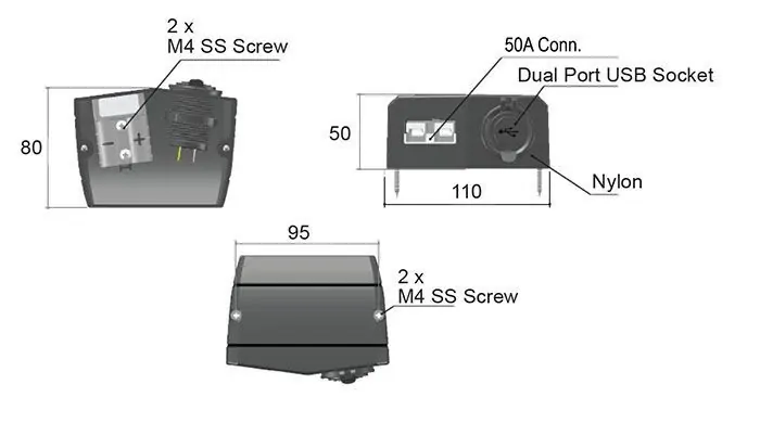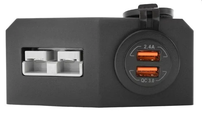 Features: • 3.0/2.4A USB Output • Surface Mount Style • 50A Grey Anderson Style Connector • Black Nylon Housing • Dimensions: 110 x 50 x 80mm • Mount. Hole Centre to Centre: 95mm