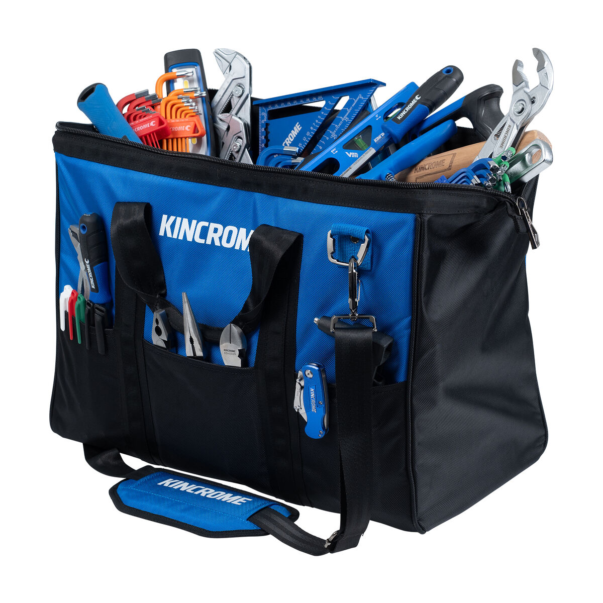 The 520mm Soft Base Wide Mouth Tool Bag is built for maximum durability and convenience, featuring heavy-duty 1680D polyester construction that can withstand the toughest tasks. Its wide mouth allows for easy access and viewing of your tools, while 11 strategically placed pockets—6 external and 5 internal—provide ample storage space. The bag’s seat-belt webbing, running under the bag, cradles the contents for enhanced weight capacity and long-lasting durability. Inside, you'll find 5 internal elastic tool loops. The water-resistant material treatment, adjustable heavy-duty seat-belt shoulder strap with a wide padded shoulder pad, and reinforced twin webbing carry handles with steel rivets ensure comfortable carrying. Additional features include heavy-duty metal D-rings, carabiner swivel clips, extra-large zip pullers, and 4 rubber base pads for grip and stability, making this tool bag the ultimate choice for professionals needing reliability and strength on every job.