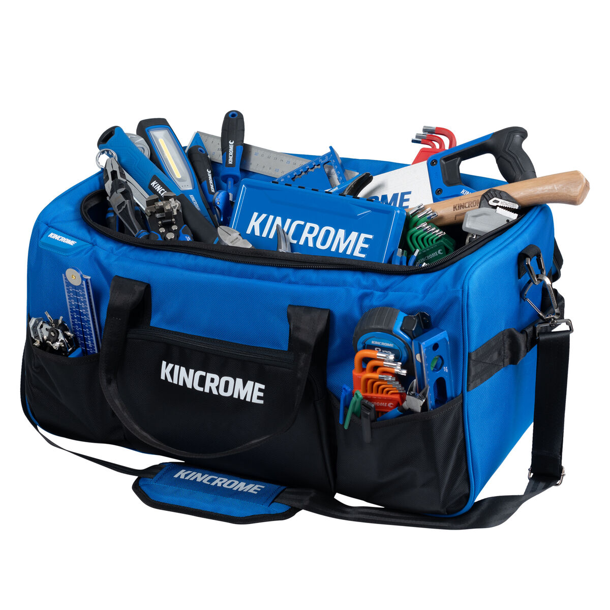 The 625mm Duffle Bag is built to withstand tough environments, made from durable 1680D polyester for superior strength and performance. Designed for ultimate organisation, it features 14 pockets—6 external (including one large zipper pocket) and 8 internal—along with 16 internal elastic tool loops to keep your tools secure and easily accessible. The water-resistant material treatment ensures your gear stays protected from the elements. For added convenience, the bag includes a concealed pouch for Bluetooth, GPS, and smart tracking devices, as well as an external tape measure clip. The adjustable heavy-duty seat-belt shoulder strap with a wide padded shoulder pad ensures comfort, while the twin webbing seat-belt carry handles with PVC grips are reinforced with steel rivets for extra durability. The ground-guard rails keep the bag elevated to protect its contents. Featuring Kincromes signature all metal hardware including heavy-duty metal D-rings & carabiner swivel clips. The main compartment is lockable via extra-large zip pullers (padlock not included), making this tool bag a secure and reliable storage solution for professionals on the go.