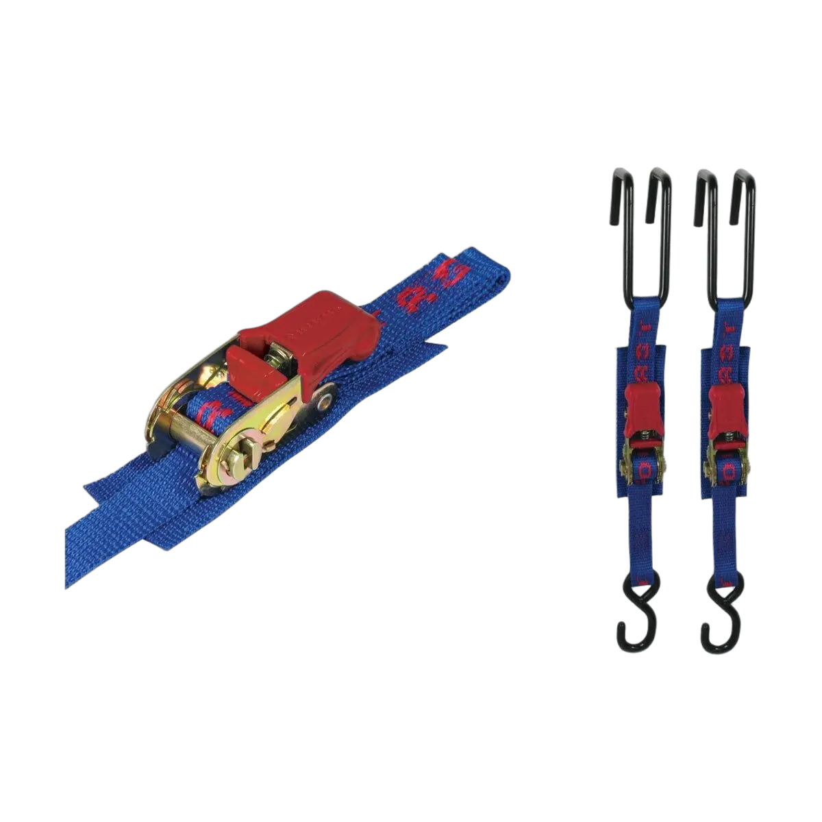 • Pair of 25mm x 1m webbing tie downs with transom hook one end and black plastic coated ‘S’ hook the other end