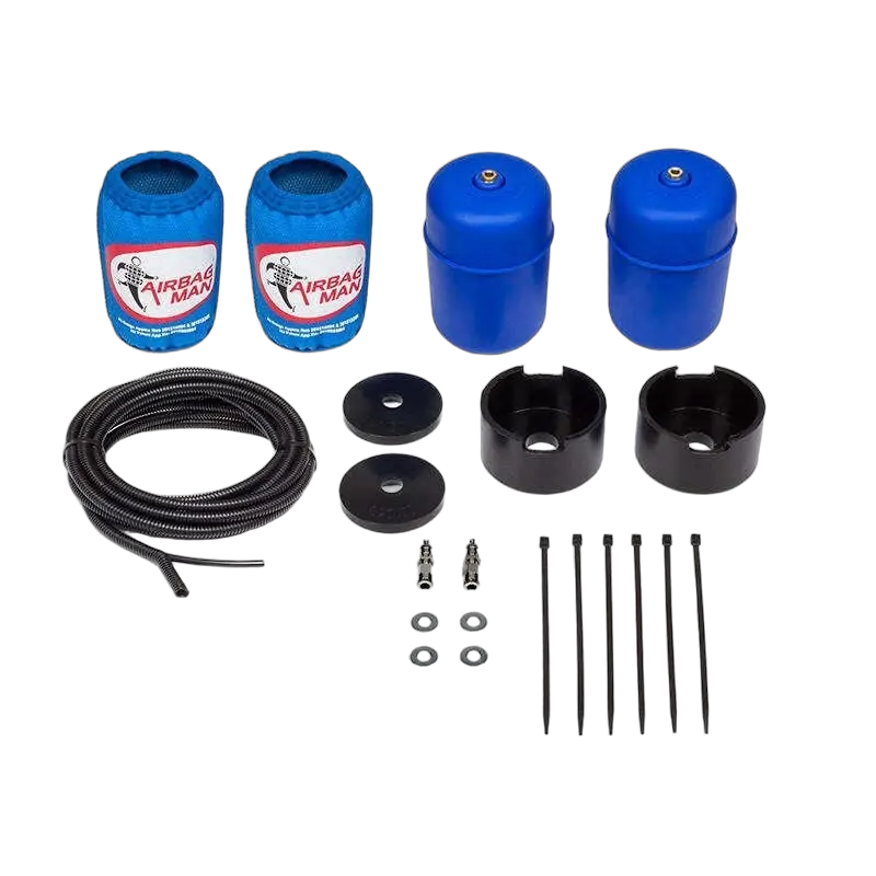 Airbag kit includes two airbags, high pressure sleeves, airbag end protectors, air line tubing and two inflation valves, full instructions included