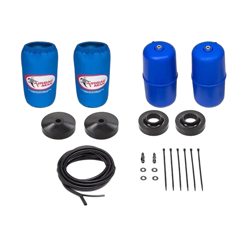 Airbag kit includes two airbags, high pressure sleeves, airbag end protectors, air line tubing and two inflation valves, full instructions included