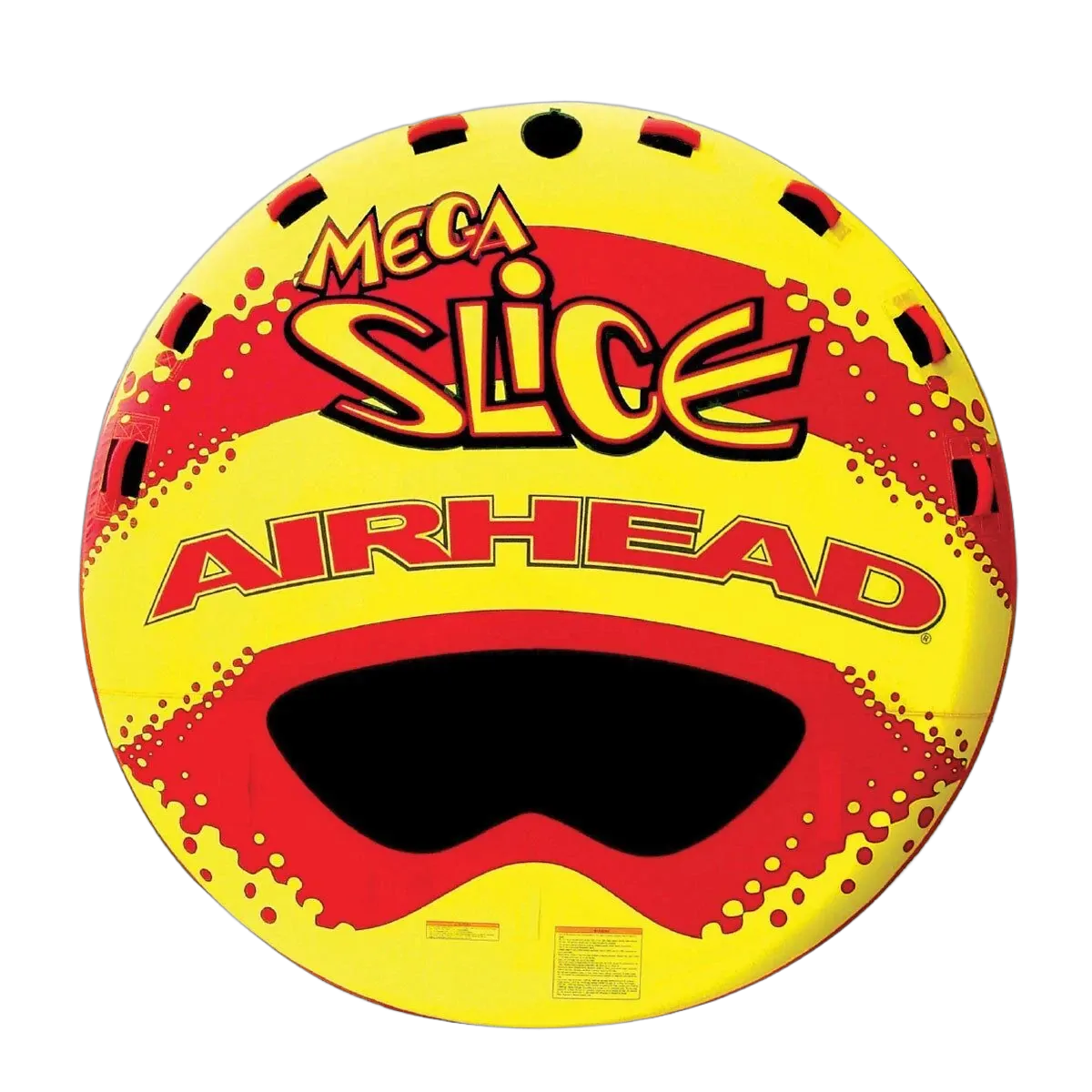 Mega-Slice Is the colossal 2.5m diameter (deflated size) member of the Airhead Slice-series, the industry standard in deck tubes. The exclusive tapered profile, thick at the front and thin at the back, enhances your tubing experience. The thicker front allows a more natural and comfortable rider position and prevents submarining. It's super easy to climb onto Mega-Slice from the water because it's thin at the back and has 5 boarding straps to grab onto. The 8 deluxe handles with neoprene knuckle guards provide a great grip for 1, 2, 3 or 4 riders. An Indy Cap covers the Boston valve. Connect Mega-Slice to an Airhead Tube Anchor and you have an instant swim platform!
