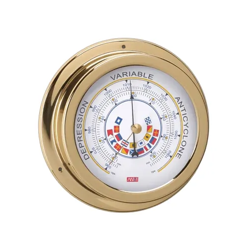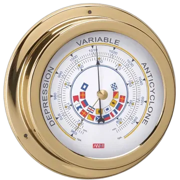 A range of quality European made "ANVI" brand brass nautical instruments including clocks, tide clocks, radio room clocks, barometers, hygrometers and thermometers.