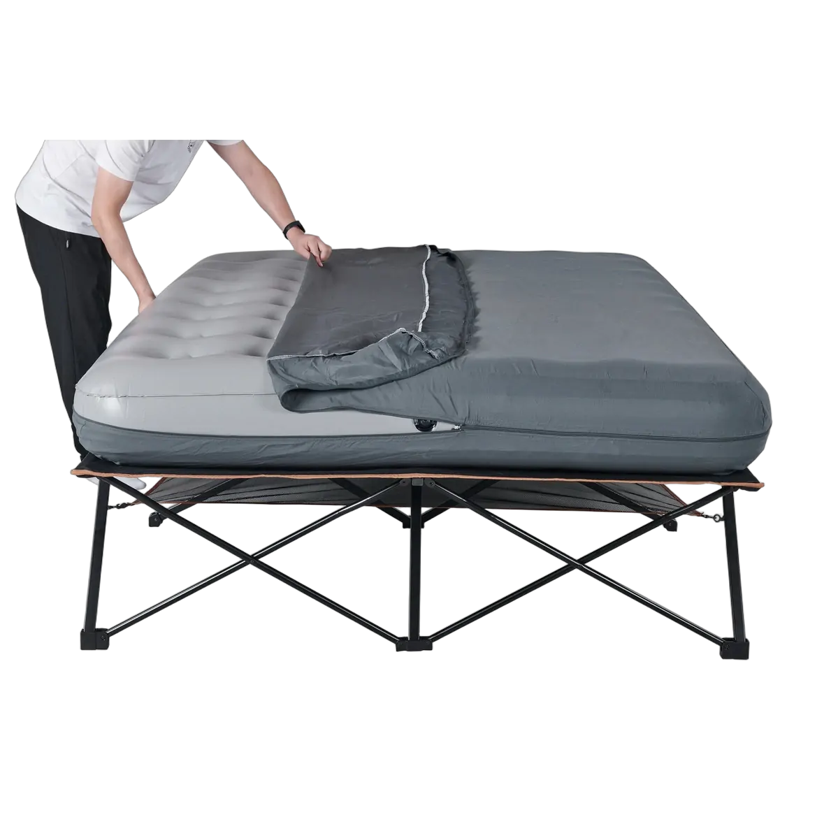 The Anywhere Queen Deluxe Bed offers the ultimate combination of comfort, convenience, and practicality. The queen-sized Easy Fold Stretcher frame supports a 23cm high air bed which aids in a comfortable nights sleep. Elevating sleepers off the ground, the Anywhere Queen Deluxe Bed provides not only comfort but also cleanliness, thanks to its easy-clean powder-coated frame and a removable, machine brushed polyester cover that protects the air bed. Designed with taller people in mind, its generous length ensures a comfortable sleeping experience. The Anywhere Queen Deluxe Bed folds into a carry bag making it ideal for both travel and storage, ensuring comfort whether at home or on the go.