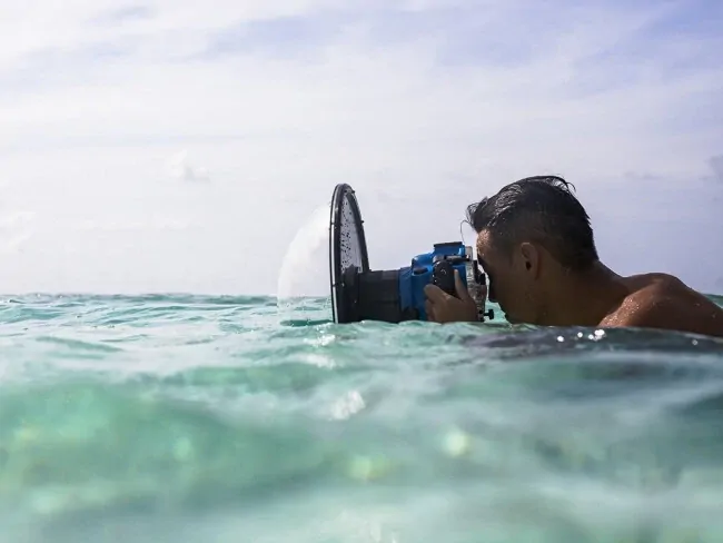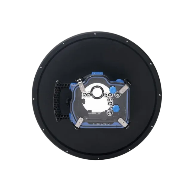 There are in fact many reasons why you would use this specialized equipment, but there are 2 main reasons large dome ports are used for creating over/under images. Magnification and Dome Radius. The curved surface of a dome port counteracts the magnification effect that happens to light when it passes through water. When viewed through a flat surface (like your snorkel mask or a fish tank) subjects underwater will appear bigger than they actually are. This is not a problem when your entire composition is underwater, but when you want to view a subject above and below the surface things begin to get weird... The large radius of a 16" dome also adds more distance between the camera lens and the water surface. This distance allows the lens to easily see above and below the water plane and also provides a smaller water line in your image which is less distracting and more visually pleasing.
