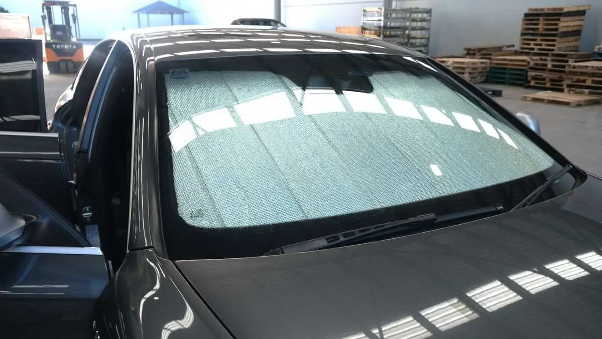 Note: Our custom sun shades block out a significant amount of light and UV rays that enter from the front windscreen, however due to the angle of the front windscreen and additional sensors or different mirror shapes/sizes available for different models, there may be slight gaps around your rear-view mirror or sides to allow the sun shade to fit.