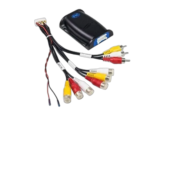The PAC Audio 2-way video switching interface features two sets of AV (left/right audio and video) inputs and one AV output for switching between two AV sources.