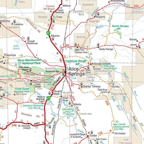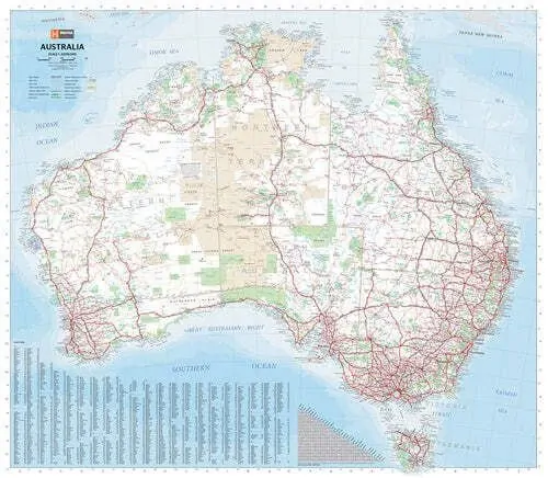 A laminated map of Australia that is ideal as a reference and trip planning tool, with the country's major road networks featured along with Outback fuel, distances and major national parks marked on the map.Comes packaged in a tube.