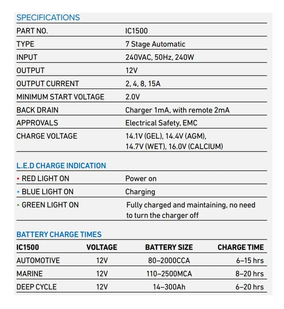 The perfect charger for large batteries found in boats, camper trailers and caravans, the IC1500 is ideal for permanent fixture offering a fast and comprehensive charge when off the beaten track.