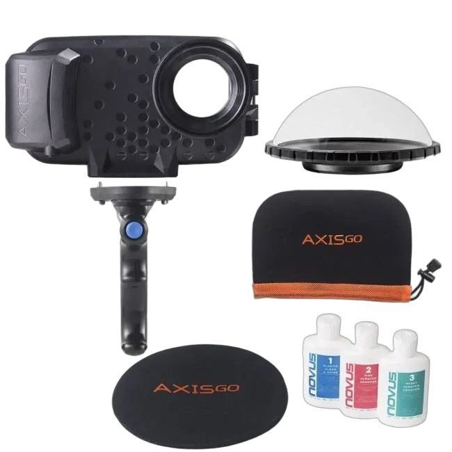 Our AxisGO bundles are the best way to buy all the AxisGO gear you need in one click! The AxisGO 12 Pro Over Under Kit is perfect for those who capture a lot of underwater images, or who want to capture the Over/Under style images where you see above and below the waters surface in the same image. Yes, it's possible to do that all from your phone! This kit also includes everything you need to look after your new gear with an AxisGO Dome Cover included as well as Novus Acrylic Polish to buff out any minor scratches you may get on the dome element. To top it all off, the AxisGO Bluetooth Pistol lets you take all the images single handedly. This kit will guarantee you endless enjoyment and push your iPhoneography to levels you never before thought possible.