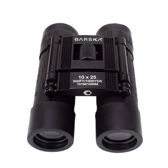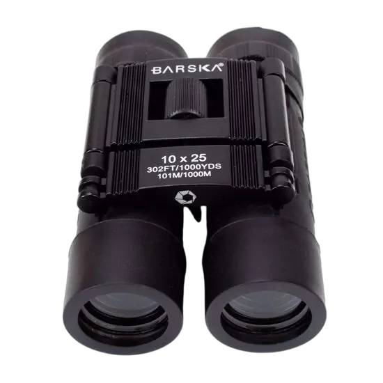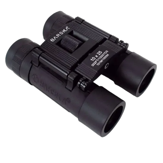 The 10x 25mm Lucid View Binocular from Barska is a compact binocular engineered to perform under conditions requiring lightweight portability and carrying comfort. The Lucid View binocular features BK-7 roof prisms and fully coated optics thereby maximizing light transmission and making bright images available to the viewer. They possess a compact folding dual-hinge bridge design with a centered focus knob. Ergonomic and shock absorbing rubber armoring with a firm grip serve up a secure and comfortable hold with added shock-resistance. Whether hiking, bird watching, or hunting, this binocular has a compact convenience that's worth carrying along.