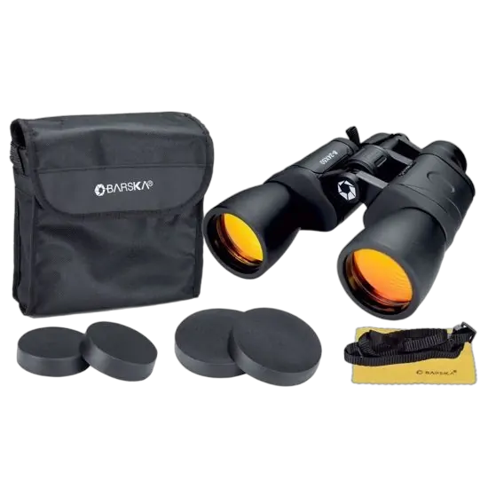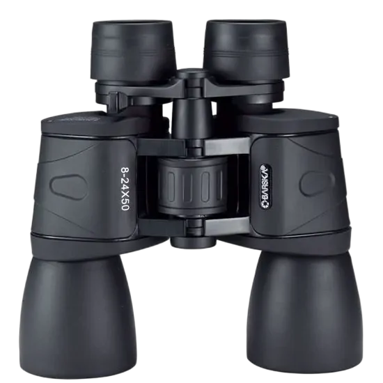The 8-24x50mm Gladiator Zoom Binocular from Barska is designed for long distance terrestrial and astronomical viewing. The variable magnification range of the binocular allows the viewer to scan a large field of view and then zoom in on the selected object for a closer and greater detailed look. A zoom thumb-lever for making quick and smooth magnification changes is featured. Fold-down eyecups are incorporated into the eyepieces for comfort viewing with or without eyeglasses.
