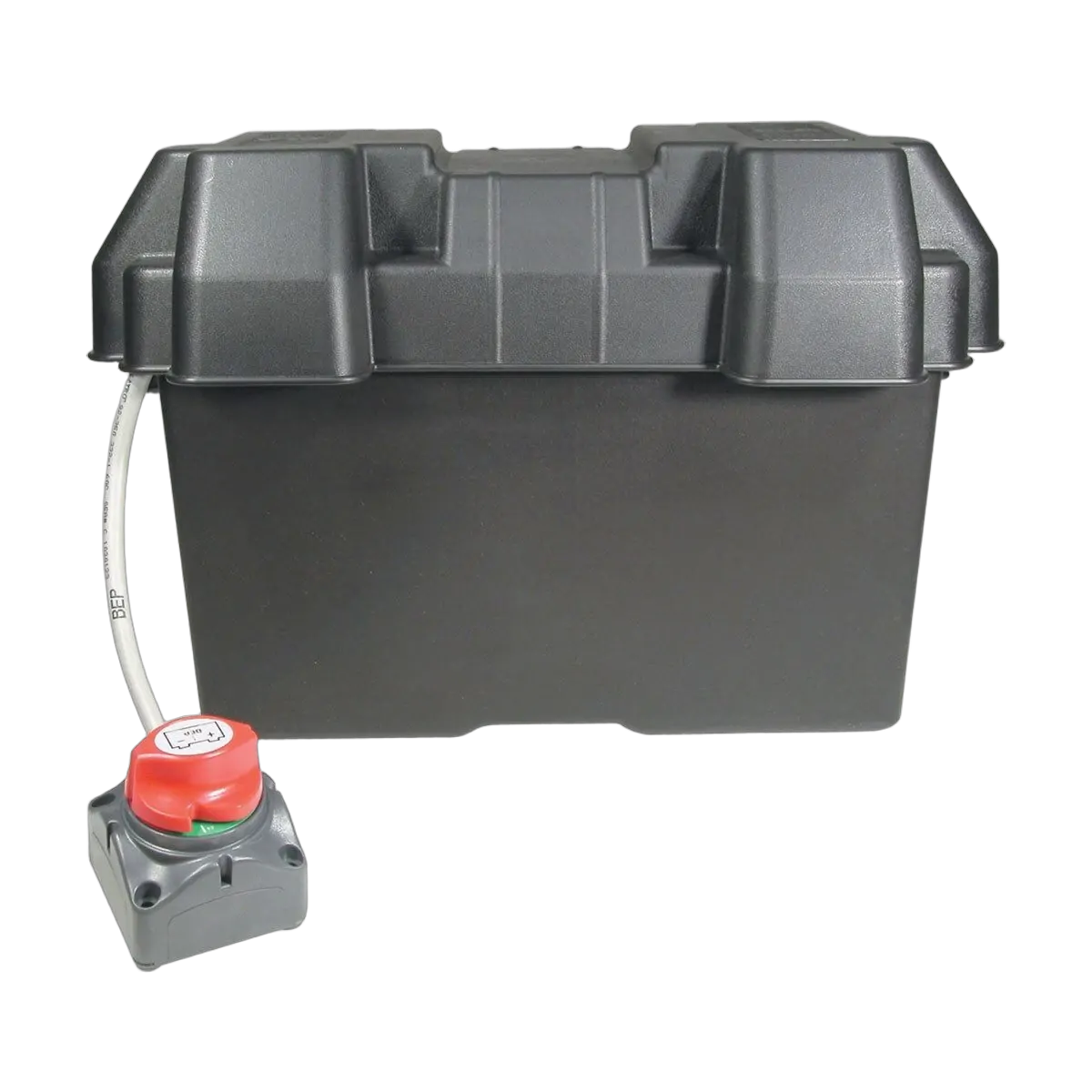 Sturdy black plastic battery boxes fitted with Marinco® BEP 701 mini battery master switch, 500 mm length of 200 amp tinned wiring and marine quality battery terminals.