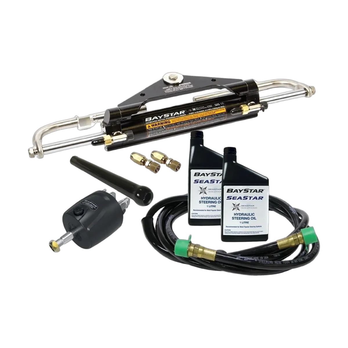 Complete BayStar™ steering kit (291561) providing the flexibility to enable the installer the ability to make whatever hydraulic hose length required, without the need for specialist swaged fittings. The two unique re-usable brass end fittings allow the installer to simply cut the hose to length and insert the brass connectors. Complete kit includes 50 foot length of outboard hose, BayStar™ helm, BayStar™ front mount cylinder, hydraulic oil, rubber boot and two re-usable hose fittings.
