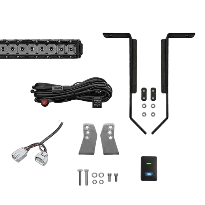 - Purpose-built Hilux light bar bracket, powder coated black - High-Beam Plug & Play wiring tap - Complete wiring harness including inline fuse - OEM-Style switch to fit into factory switch blank - Mounting hardware - ULTRAVISION Raptor 125W LED Bar"