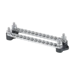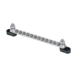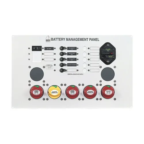 Preassembled module with white powder coated aluminium recessed face plate containing five 113548 Mini Battery Master Switches, Bussmann heavy duty circuit breaker for anchor winch, five 24 hour essential power supply ‘B’ Series circuit breakers and a 100 amp ‘C’ Series circuit breaker for the DC main supply. Port start, starboard start and house batteries can be isolated independently with the ability to emergency parallel batteries in pairs or altogether. Space is available to fit an additional two battery switches for radio, genset, anchor winch, bow thruster type applications or DVSR. It is also possible to fit an additional two ‘C’ Series circuit breakers for high load applications and up to five more essential circuits ‘B’ Series circuit breakers.