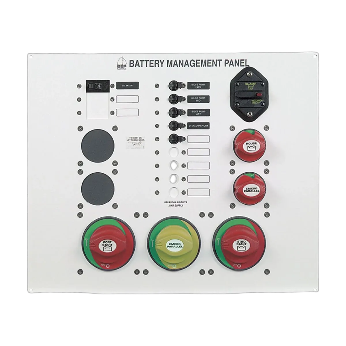 Preassembled module with white powder coated aluminium recessed face plate containing 113551 heavy duty Battery Master Switches to cater for higher start up current of larger diesels, two 113548 Mini Battery Master Switches, Bussmann heavy duty circuit breaker for anchor winch, five 24 hour essential power supply ‘B’ Series circuit breakers and a 100 amp ‘C’ Series circuit breaker for the DC main supply. Space is available to fit additional battery switches and circuit breakers as above. Supplied with a comprehensive circuit breaker label set.