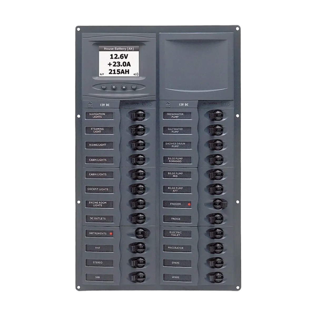 Digital panel functions include volts for up to three battery banks and current discharge/charge as well as ampere hours used and remaining for two banks. The digital meter can also be used as a tank monitor.