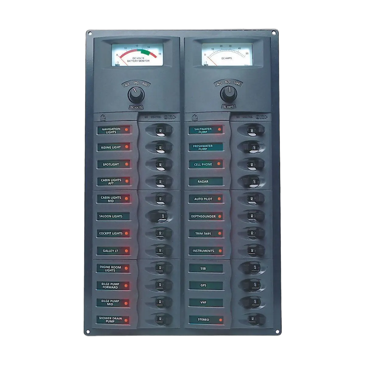 Circuit breaker panels with stylish curved front facia incorporating recesses for circuit breaker toggles preventing them from being switched on accidentally. Available with 12 volt (AV12) or 24 volt (AV24) analogue expanded scale meter with three way selector switch to monitor multiple battery banks. Larger panels include both voltmeter and ammeter. Analogue ammeters are supplied standard in 0-50 amp scale (AA50) and include a 50 amp shunt. An alternative 100 amp meter can be substituted with a corresponding 100 amp shunt. For secondary shunts refer page 211. For other label options refer pages 156 and 157. For replacement circuit breakers refer page 190.