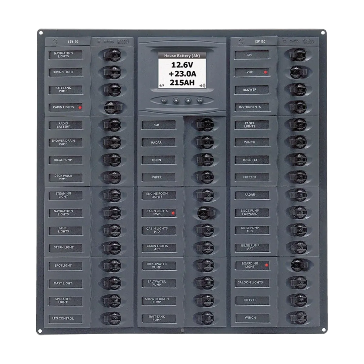 BEP Marinco Millennium 28 Circuit Breaker DC Panel - Vertical with Digital Meter (113208 - M28-DCSM) 12V or 24V Configuration* ‘Millennium’ DC Circuit Breaker Panels – with Analog/Digital Meter Circuit breaker panels with stylish curved front facia incorporating recesses for circuit breaker toggles preventing them from being switched on accidentally. IEG magnetic circuit breakers provide reliable circuit protection and accurate circuit control for equipment. Designed using the latest in sensitive hydraulic magnetic technology. They are ideal for marine applications. Temperature differences which affect fuses and other thermal devices are not a concern. One important feature of this breaker line is a ‘trip free’ action, which means the circuit will trip in the presence of an overload even though the handle is held in the ON position. The delay mechanism senses the fault and the contacts open. Millennium series panels also available in; 28 switch Vertical Panel, 32 Switch Horizontal Panel, 44 Switch Vertical Panel, 44 Switch Horizontal Panel; and, 56 Switch Vertical Panel Featuring DC System Monitor (DCSM) - Digital meter with: 8 generic user configurable inputs Programmable high/low audio/visual alarms for volts, amps and tank levels Monitors charge/discharge amps for two battery banks, capacity remaining in A/Hrs and %, battery condition, tank fluid level and Circuit Status. DC Analog/Digital Meters All analog panels supplied with one shunt, extra shunts ordered separately Panels supplied with 450A-50mV shunt. Cut-out size - 10 mm (3/8") inside all external edges All panels available in 12 or 24V configuration. All part numbers shown are 12V backlighting. Analog Ammeters and Voltmeters available in other scales All panels are available with either No Meter, Analog Meter or Digital Meters Features: Durable black powder coated marine grade aluminium base panel Marine quality, magnetic, hydraulic, UL listed trip free breakers Backlit labels supplied Negative buss bar Red LED indication for circuits ‘on’ Green LED back lighting for meters and labels Double pole configurations available for survey or additional safety DC No Meters Red systems on LED 12V (*24V with the addition of 24V Backlighting Upgrade Kit) ABYC standard voltage indication Stylish clip on contour fascia Label sets and buss bar supplied with panels- Includes Label Set #1, 2, 3, 4 and 6 (Additional labels available)