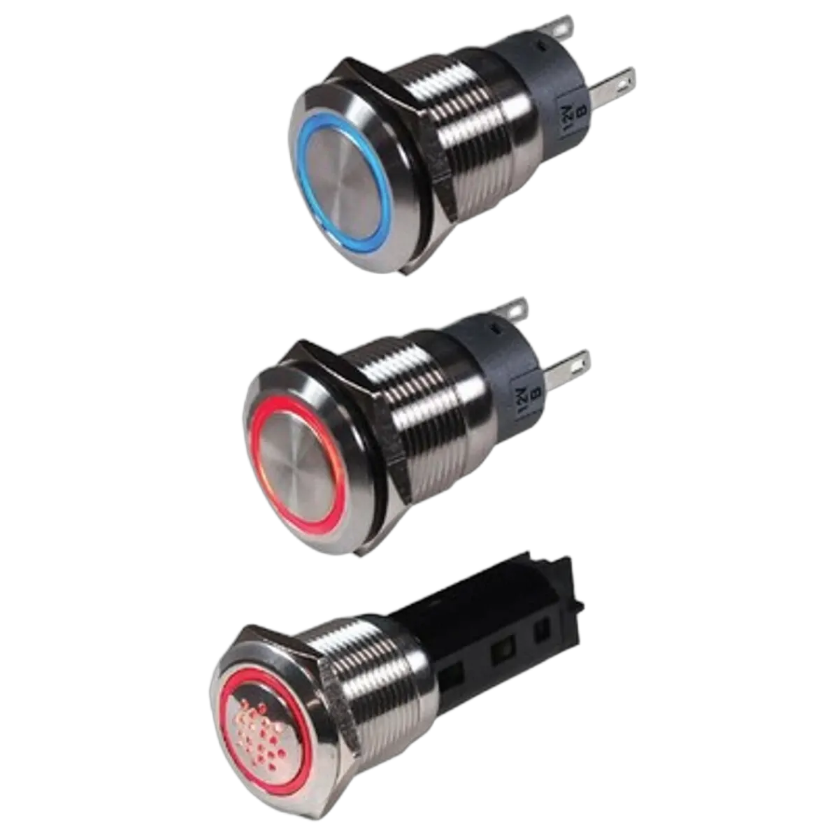 Manufactured using 304 grade stainless steel, these IP67 rated panel mount switches when instalLED are ideal for light switching or being used in custom switch and dash panels. The switches have the ability to be wired to allow the light rings, available in either red or blue surrounds, to show power to a system or may be utilised as convenient switch back lighting. Also included in the range are matching stainless steel warning buzzers with a loud 80dB tone and LED light rings. This new switch range is available in a variety of combinations, including momentary and latched Actuation. Available in either 12 or 24 volts each switch carries a maximum of 5 amps.