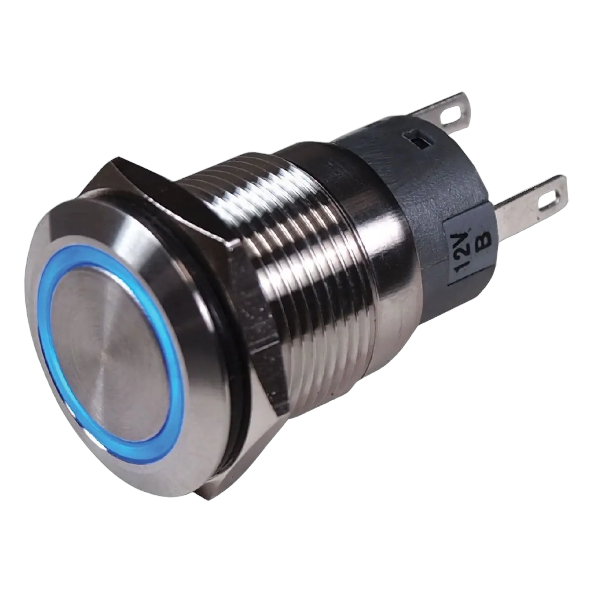 Manufactured using 304 grade stainless steel, these IP67 rated panel mount switches when instalLED are ideal for light switching or being used in custom switch and dash panels. The switches have the ability to be wired to allow the light rings, available in either red or blue surrounds, to show power to a system or may be utilised as convenient switch back lighting. Also included in the range are matching stainless steel warning buzzers with a loud 80dB tone and LED light rings. This new switch range is available in a variety of combinations, including momentary and latched Actuation. Available in either 12 or 24 volts each switch carries a maximum of 5 amps.