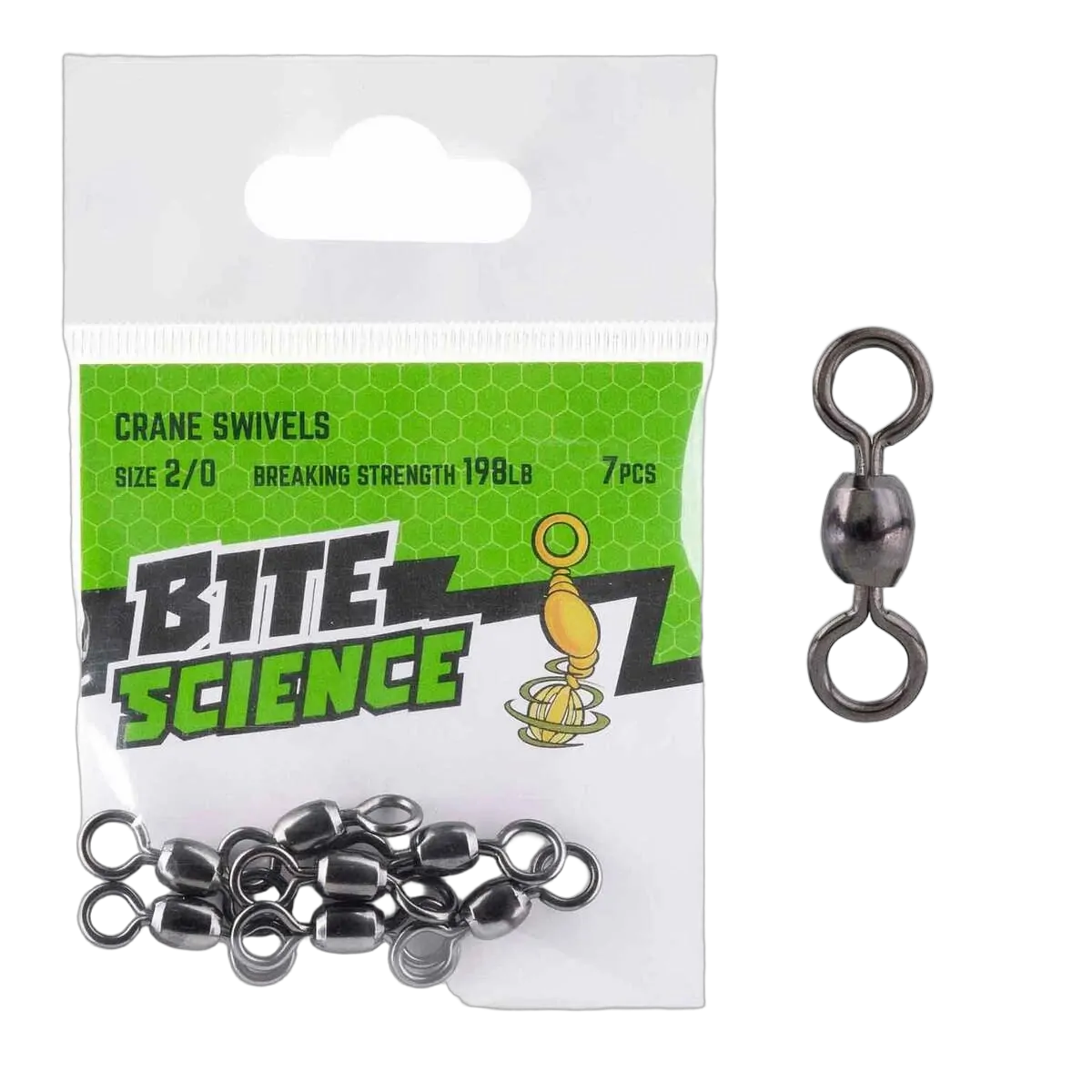 Similar to a barrel swivel, the Bite Science Crane Swivel is a smoother design that provides an improved action with great round edges for tying knots. This combined with a polished interior allows the swivel to spin easily providing a superior reduction in line twist making these swivels popular among fishermen. The black finish is to help reduce unwanted light reflection off the swivel.