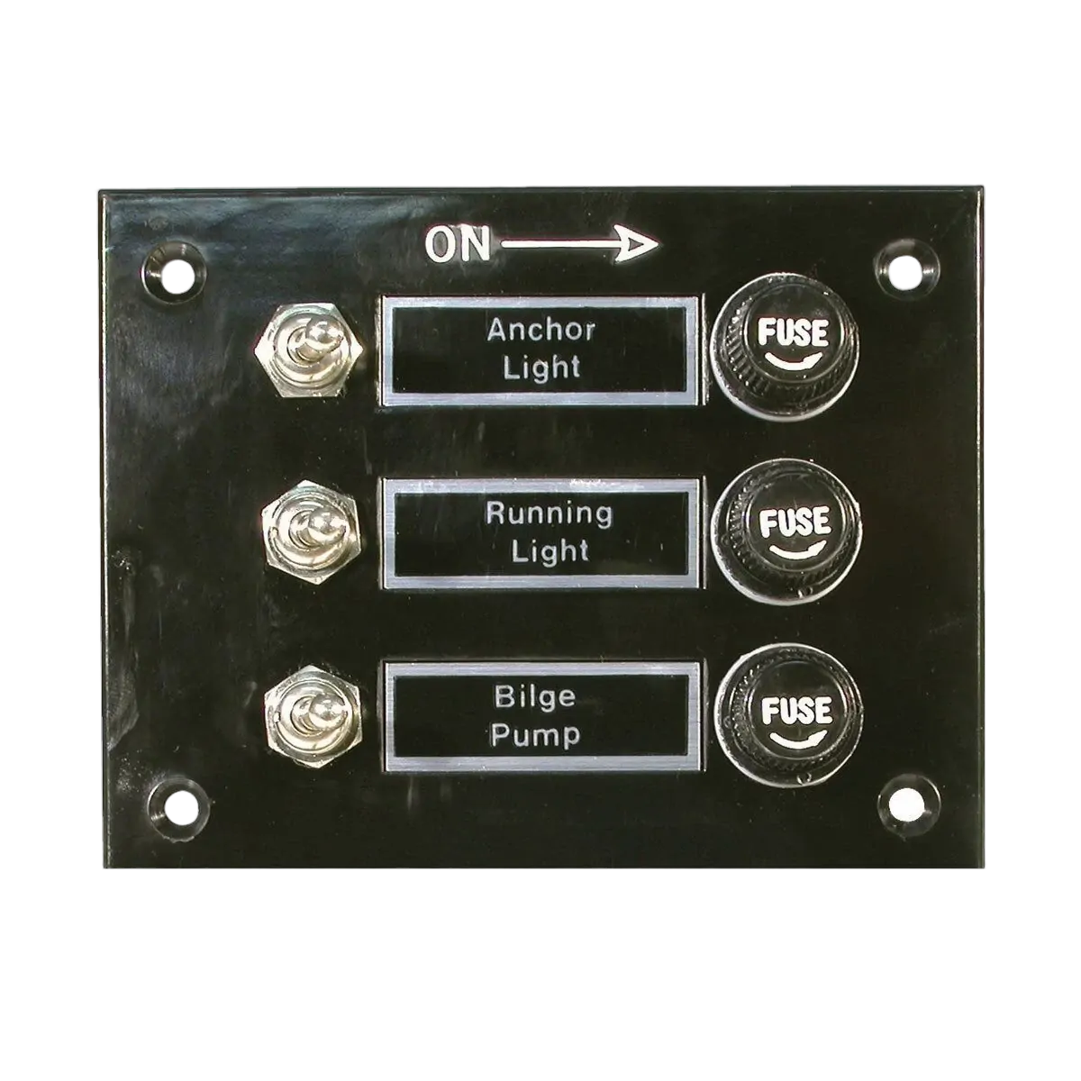 Economical switch panels. Bakelite face panel pre-wired with common supply to fuse. Screw top fuse holders and chromed brass toggle switches. 12/24 volt. Supplied with 15 amp fuses. Available in three and six gang configurations. Nameplates included.