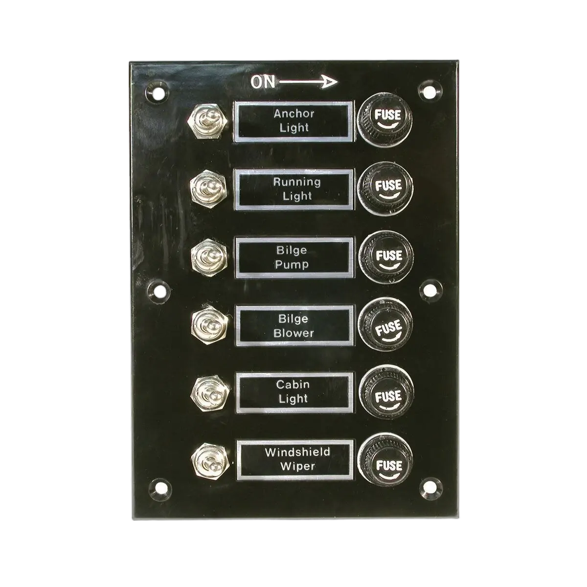 Economical switch panels. Bakelite face panel pre-wired with common supply to fuse. Screw top fuse holders and chromed brass toggle switches. 12/24 volt. Supplied with 15 amp fuses. Available in three and six gang configurations. Nameplates included.