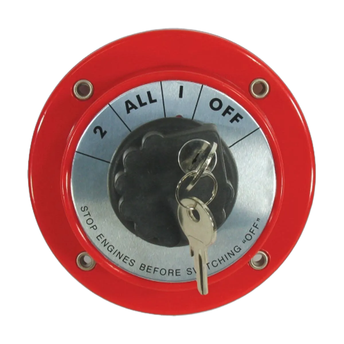Battery selector switch with key lock providing added security to engine starting. Four position options enable isolation of one battery or battery bank from the other. Also provides the ability to link both batteries in parallel. The unit can be surface or partially recess mounted.