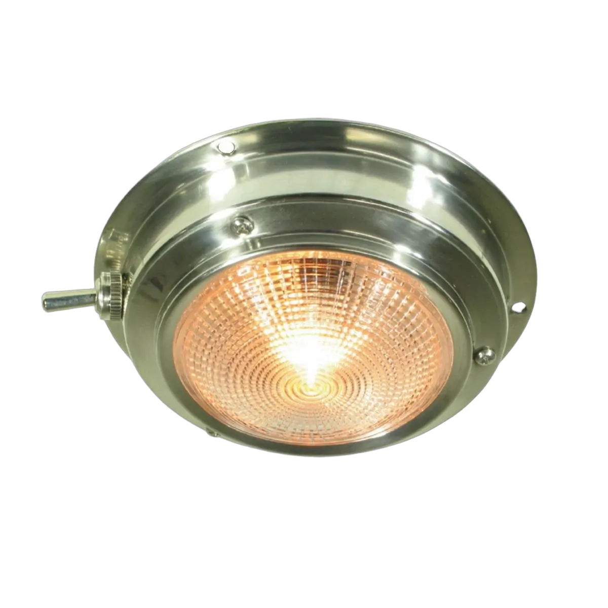Pressed stainless steel housing with integral chrome plated zinc alloy toggle switch. Glass prism lens will not distort with heat. 122110 is a dual light with a red and a clear globe and a three way switch (clear light on/off/red light on) ideal for navigation areas.