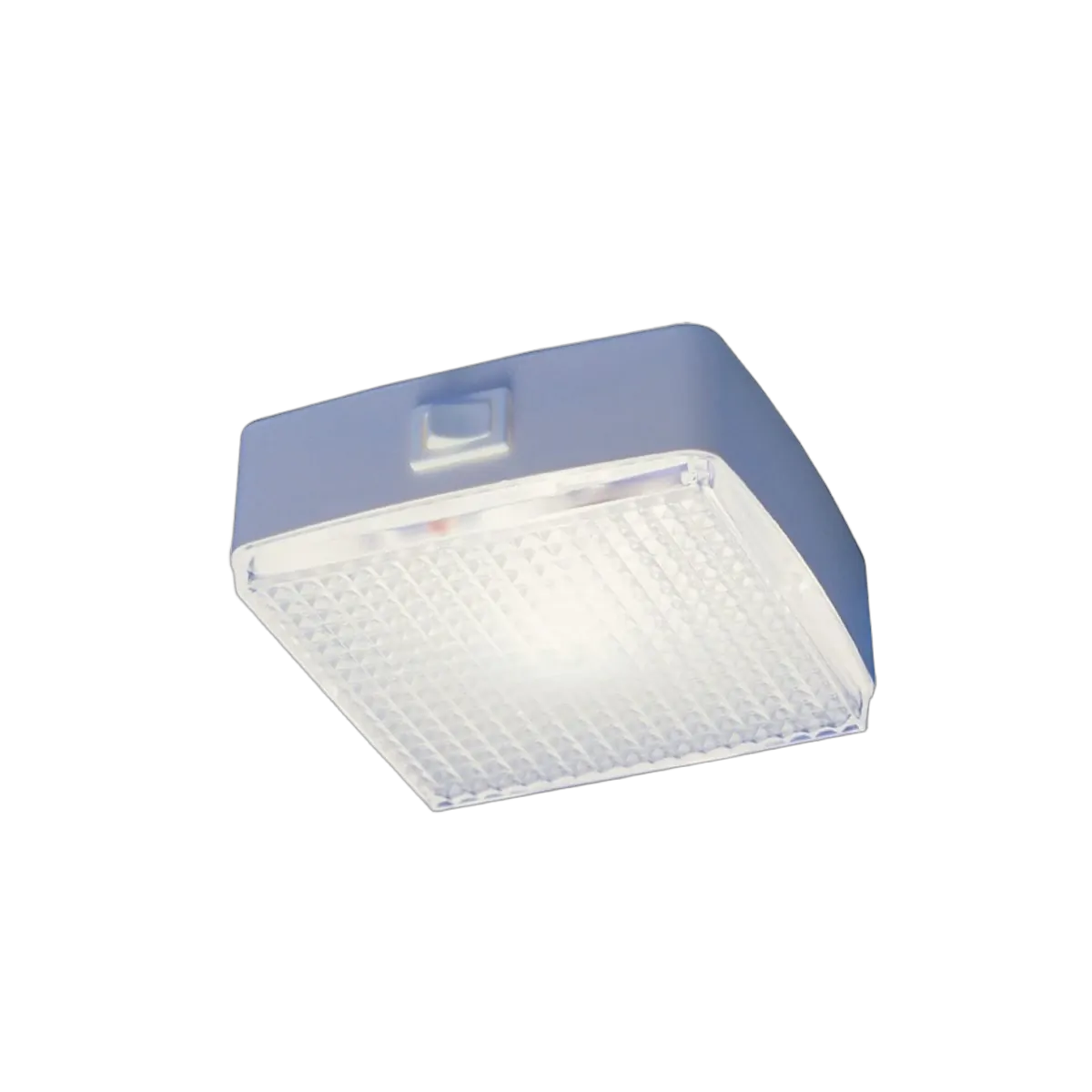 Surface mount interior light with integral rocker switch. White gloss finish moulded plastic housing. 10 watt, 12 volt halogen bulb. No visible fastenings. Diffuser lens.