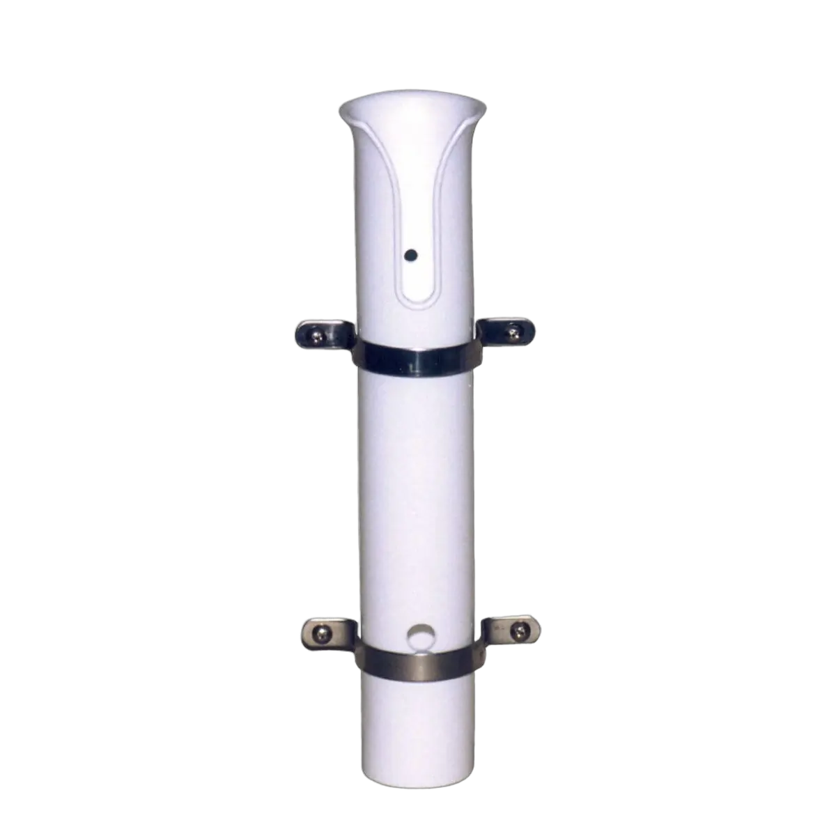 White plastic rod holder featuring flared top, slot to accept reels and open bottom for drainage. Stainless steel saddles as well as moulded in mount holes, offer a large variety of mounting options.