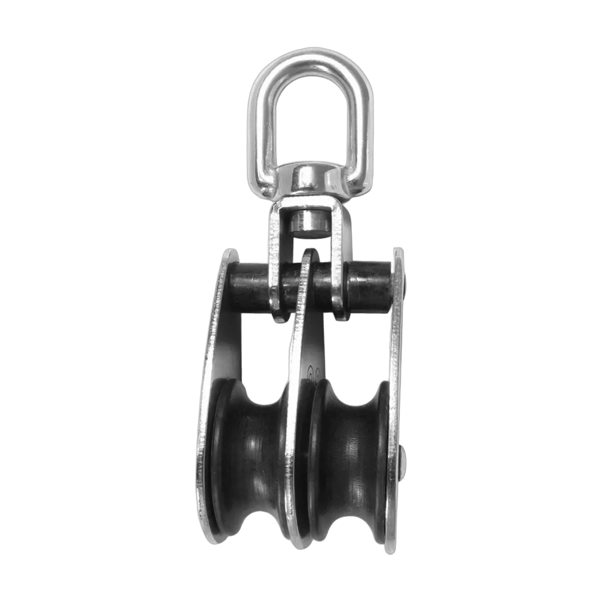 Double Blocks - Stainless Steel Block Double Swiv Eye 12X32mm Nyl Shv 166544 304 grade stainless steel cheek block with double, brass bushed nylon sheaves. Swivelling bale head. Heavy construction for commercial applications.717 MWL - Maximum Working Load