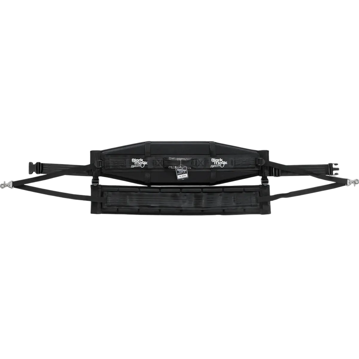 Unlike conventional kidney fighting harnesses the Black Magic Equalizer® divides the strain between the upper thigh/buttocks area and the lower back using innovative twin element padded supports