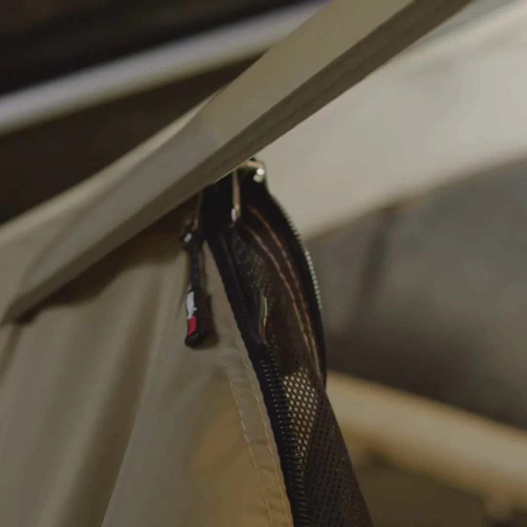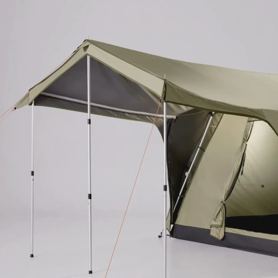 - Strong, integrated aluminium frame for ease of setup and pack down 3 pole awning to provide additional strength to the construction