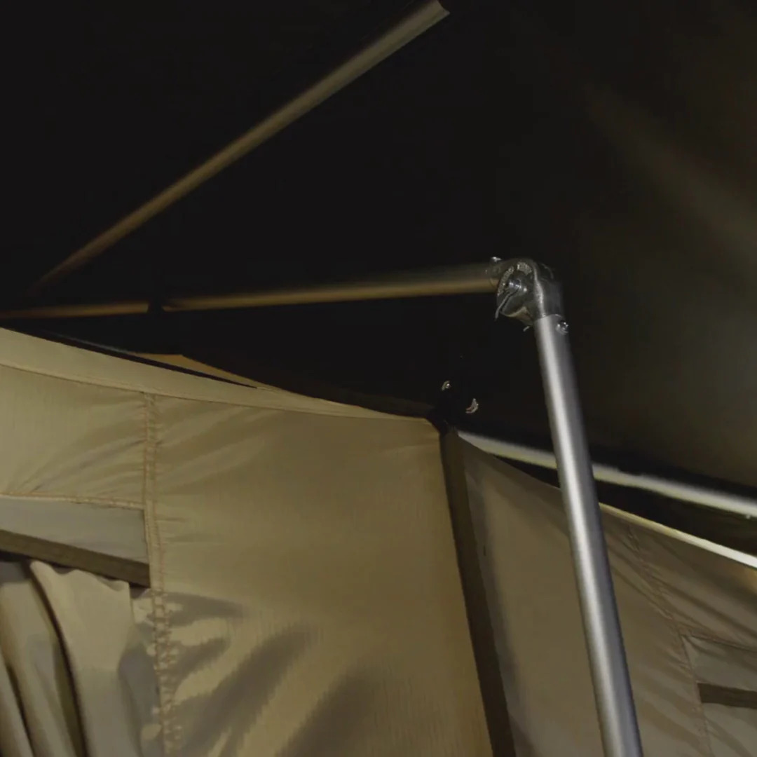 - Strong, integrated aluminium frame for ease of setup and pack down 3 pole awning to provide additional strength to the construction