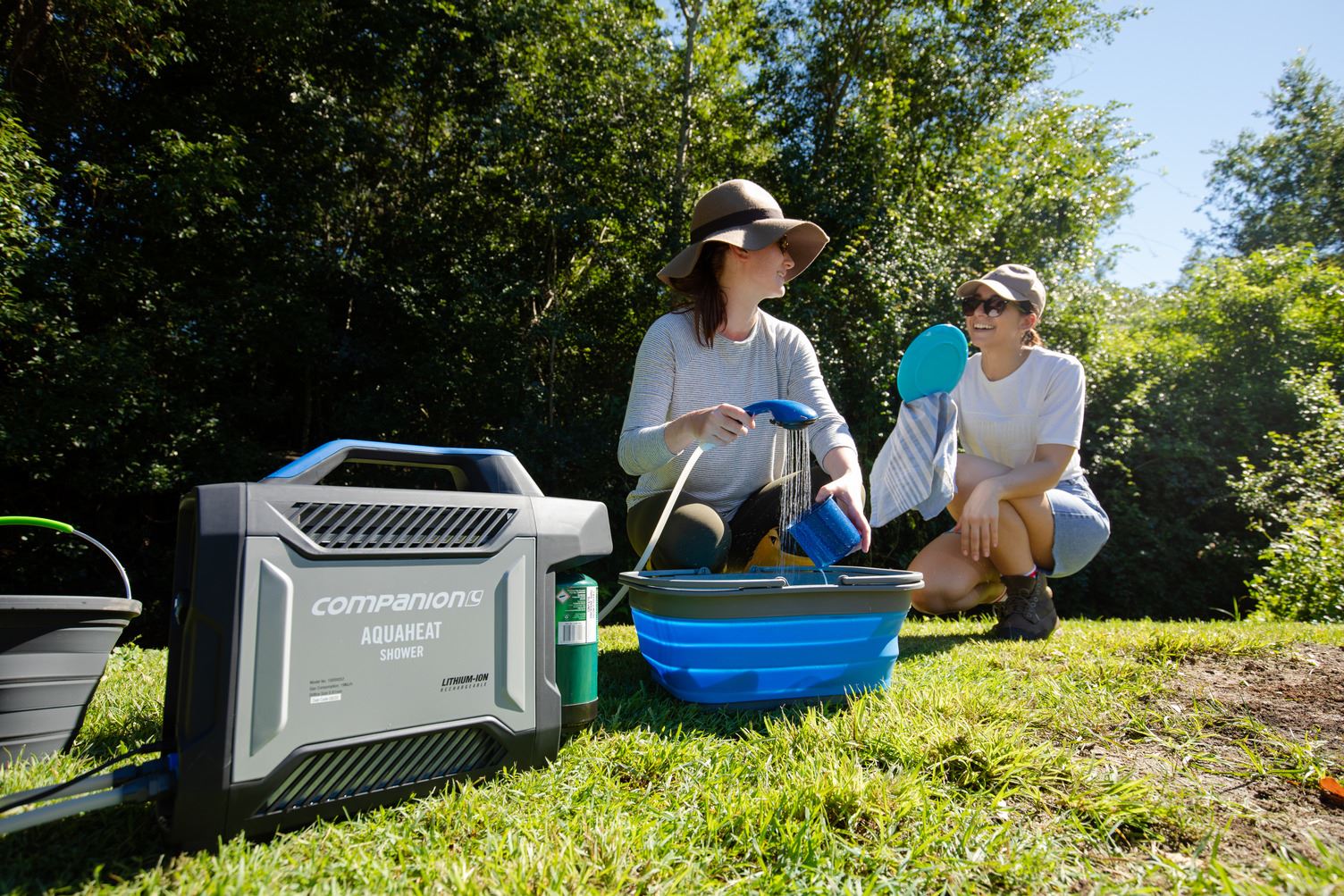 This method cleans your dishes and kitchenware as thoroughly as possible while conserving water. We use collapsible buckets, but you could also use plastic bins that are less expensive. We also strongly advise cleaning with warm water, since it makes the entire procedure easier and more fun. A simple way to produce anything near to warm water temperature, we boil a pot of water and then cut it with cold water. If this doesn't sound like something you want to do after eating dinner or when you are half asleep in the morning, make room for something like the Aquaheat. A portable hot water system from Companion that only requires propane and works of a built in lithium battery. Great for instant hot showers and sparkling clean dishes, we use it every day whilst camping.