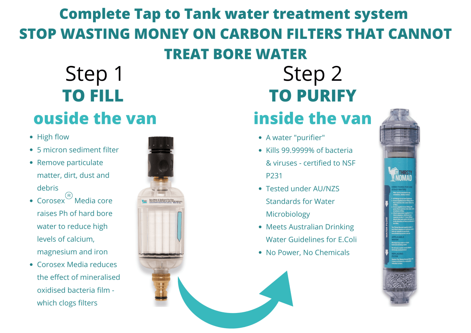 We were amazed at the number of certified, proven and tested water treatment technologies you get in two small compact light weight filters, specifically designed to treat Australia’s mineralised bore water and especially designed to purify your caravan water to Australian Drinking Water Guidelines for E.Coli, which is “zero”.