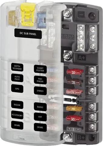 • Clear insulating cover with label recesses and storage for two fuses, satisfies ABYC/USCG insulation requirements