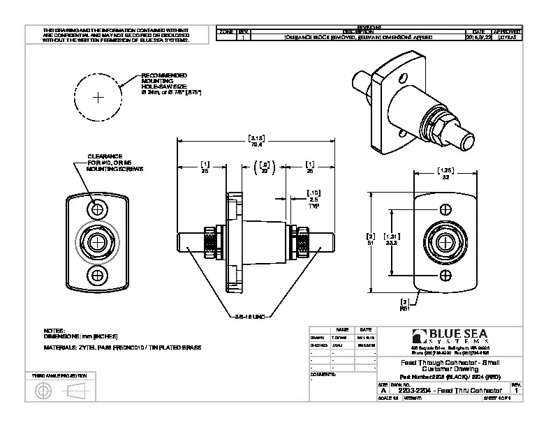 • Large cables passed through holes are subject to chafing even when protective grommeting is used. Terminal Feed Through Connectors eliminate chafing and provide excellent strain relief for the cable