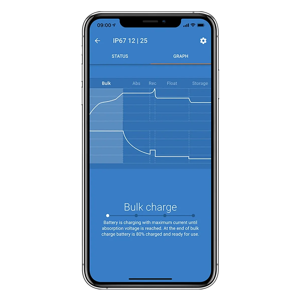 Check the status of your battery remotely- The Blue Smart IP22 is equipped with built-in Bluetooth, so the status of the charger and the battery can be checked on a smartphone, tablet or laptop. All settings of the charger can be configured with the VictronConnect app.