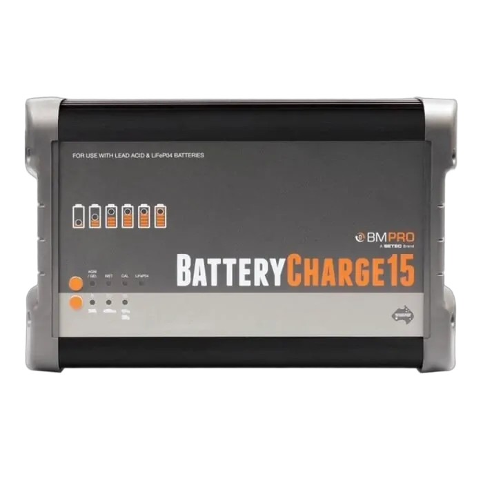 BMPRO's BatteryCharge15 is an automatic battery charger with seven charge states designed to increase your battery's life and performance. Depending on the size of the battery, output current is adjustable to 5, 10, or 15 Amps and is compatible with all 12Volt Lead Acid (AGM, Gel, Calcium, Wet) and LiFePO4 Lithium batteries. The BatteryCharge15 is ideal to service your car, caravan, farm equipment, communications, truck or boat battery charging needs.Equipped with short-circuit, over-temperature and overload protection, the BatteryCharge15 has LED indicators to let you know the charge progress of your battery. The BatteryCharg15 can also be used in 'power supply' mode when not charging your battery.