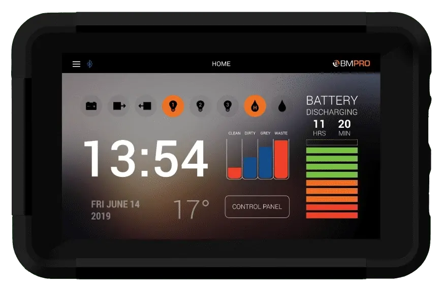- Operate main electrical features of your caravan from the touchscreen of a portable tablet.