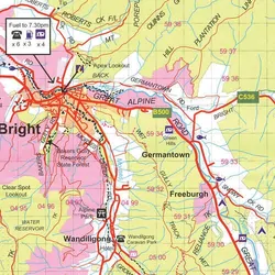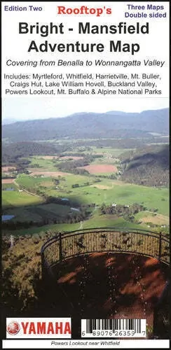 A map that covers Wonnangatta Approaches, Mt Buffalo Plateau, Alpine National Parks and more. A Bright and Mansfield town map is also a useful part to this map.